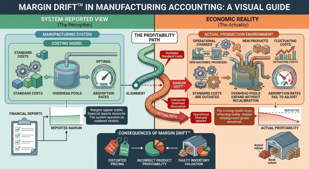 Margin drift occurs when the costing model inside a manufacturing system gradually stops reflecting how production actually behaves. Standard costs become outdated, overhead pools expand without recalibration, and absorption rates fail to adjust to operational changes. Financial reports may still reconcile and margins may appear stable, but the reported profitability slowly separates from economic reality. […]